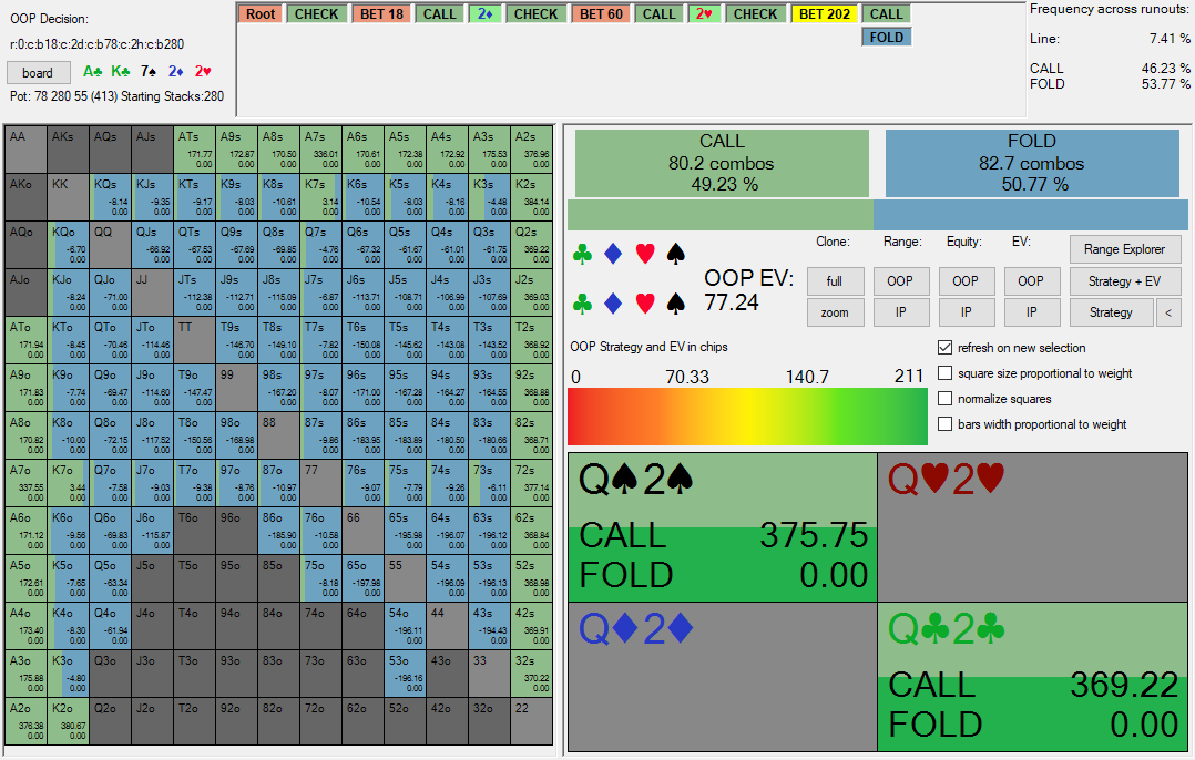 Na turnu CO nadaljuje z betom pri 61%, od tega 140 kombinacij za value in 94 kombinacij bluff in semi-bluff. Od checkiranih so drugi in tretji pari, QJ in QT kot gutshosta, ki imata dovolj equitya proti call cbet – fold turn rangeu nasprotnika. Checkira tudi dve over karti sedmici, saj se CO skoraj nobenemu handu ne odpove.
