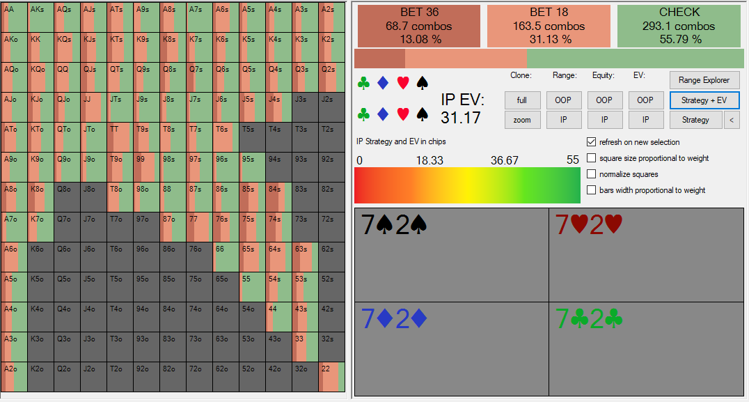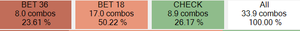Prav tako si bomo pogledali, kateri bet sizing med 1/3 in 2/3 pota je boljši za naš range, zato se bomo v analizi osredotočili le na igro na flopu.