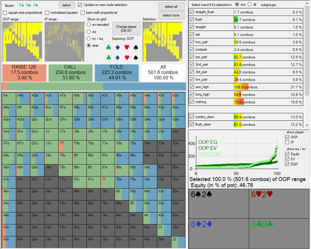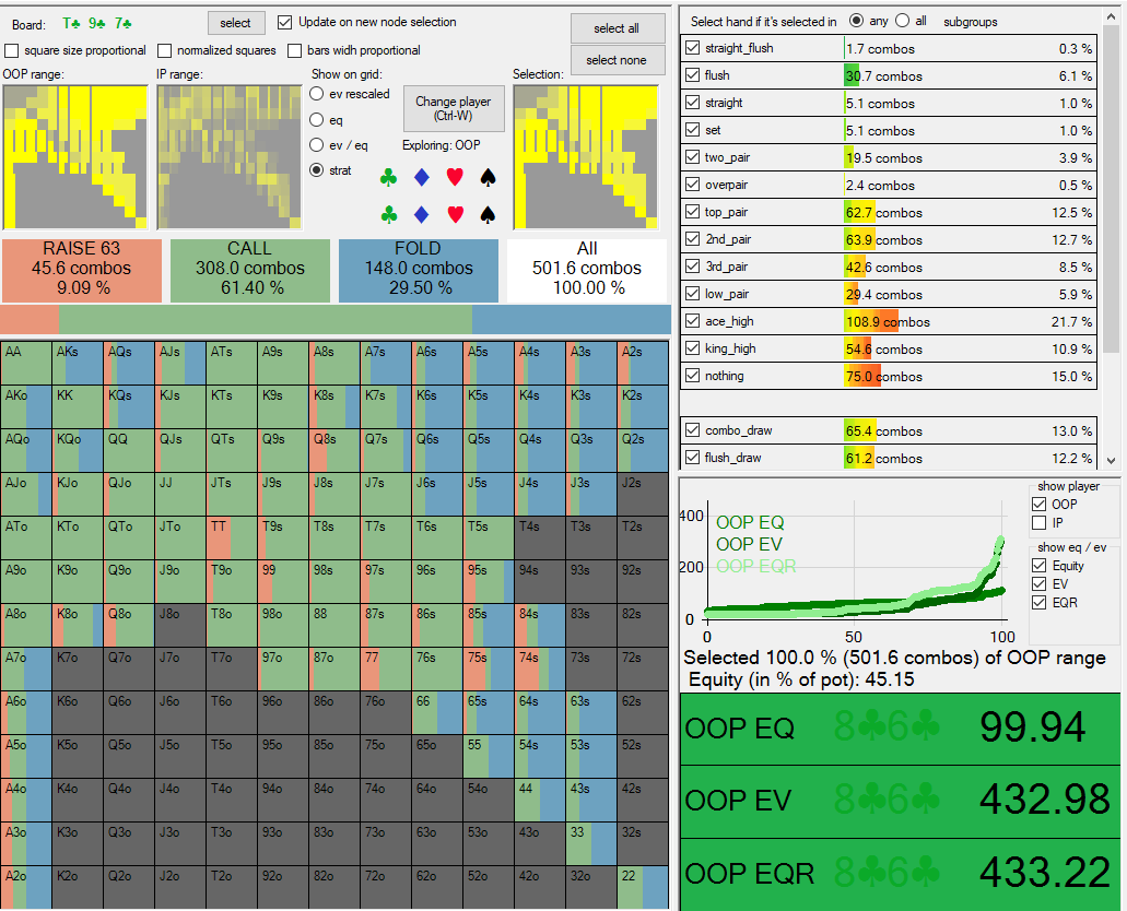 S flushi, lestvicami in nekaterim dvema paroma, bo naš range v poziciji ostal zelo balansiran in bomo kljub veliko bluffom še vedno imeli 49% EV.
